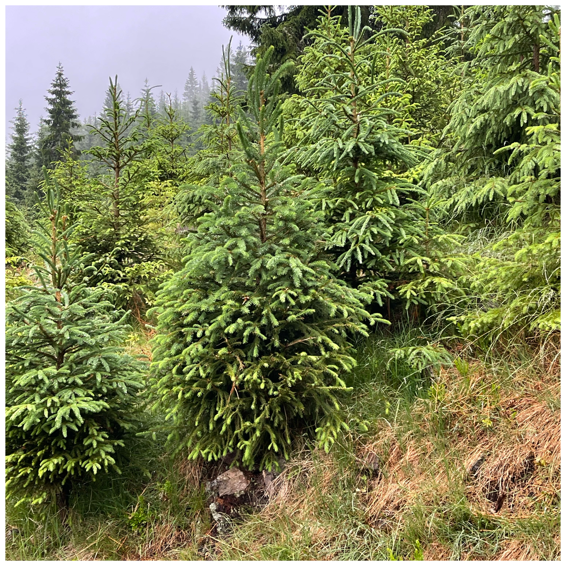 Trærne er Klassisk Norsk Gran, økologisk dyrket (ikke sprøytet med gift), de er plantet i sitt naturlig skogsterreng der de egentlig hører hjemme og ikke på ett jorde.